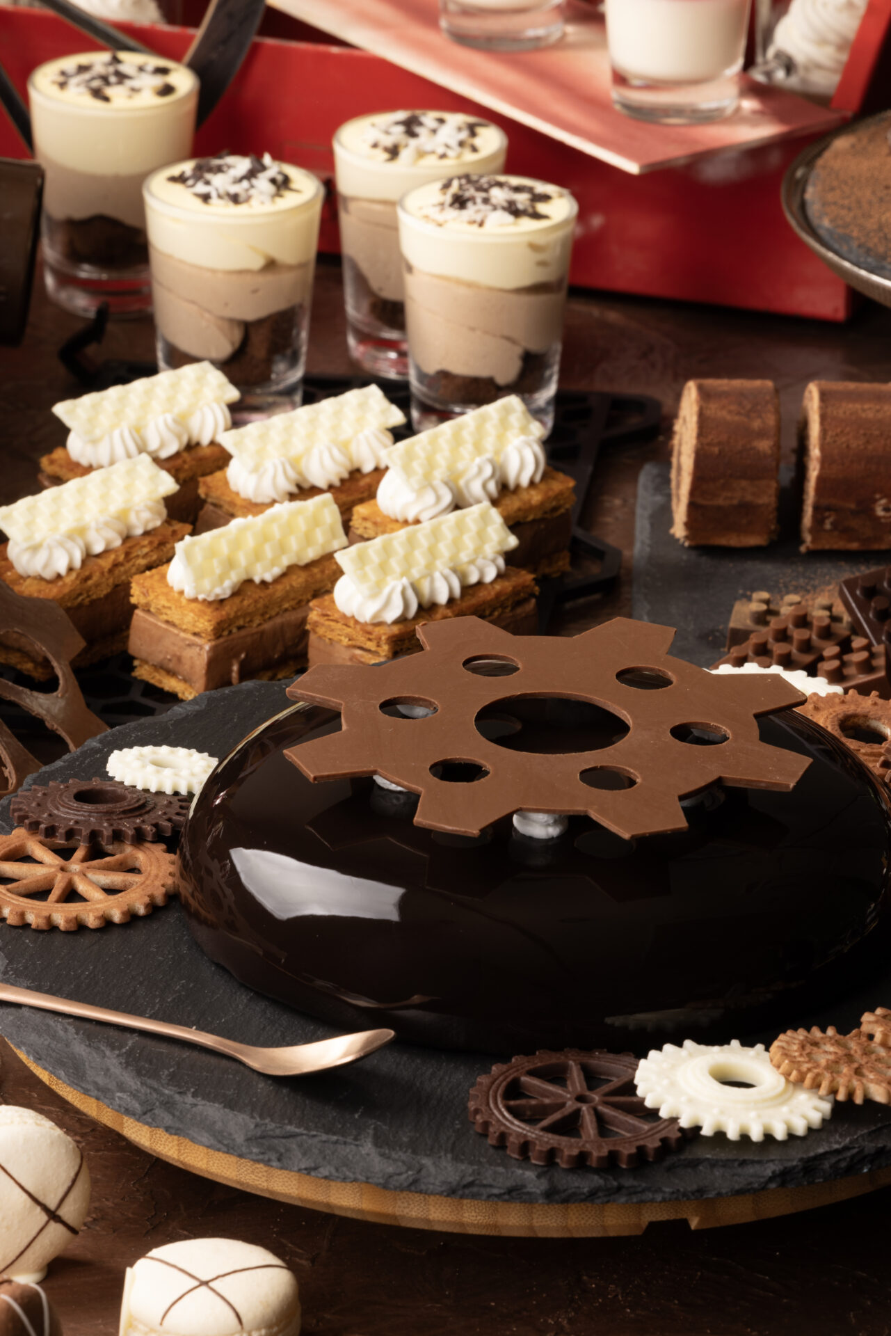 ラズベリーガトーショコラ/チョコレートクリームガトー/チョコレートとチェリーのガトー/スウィートチョコレート・テリーヌと抹茶チョコレート・テリーヌ/バラの香りとホワイトチョコレートムース/生チョコレートロールケーキ/ショコラ・エクレア/ロリポップ(ストロベリー・オレンジ・紅茶味)/ミルクチョコレートとホワイトチョコレートのマカロン/焼きチョコレート/チョコレートカスターのミルフィーユ/チョコレートとナッツのクグロフ/チョコレートカヌレ/ショコラカラメルムース/ショコラオペラ/ショコラカフェジュレ/ミルクチョコレートとパッションフルーツのヴァリーヌ/ホワイトチョコレートのパンナコッタ/チョコレートブリュレ/キャラメルショコラババロアとラズベリークリーム など