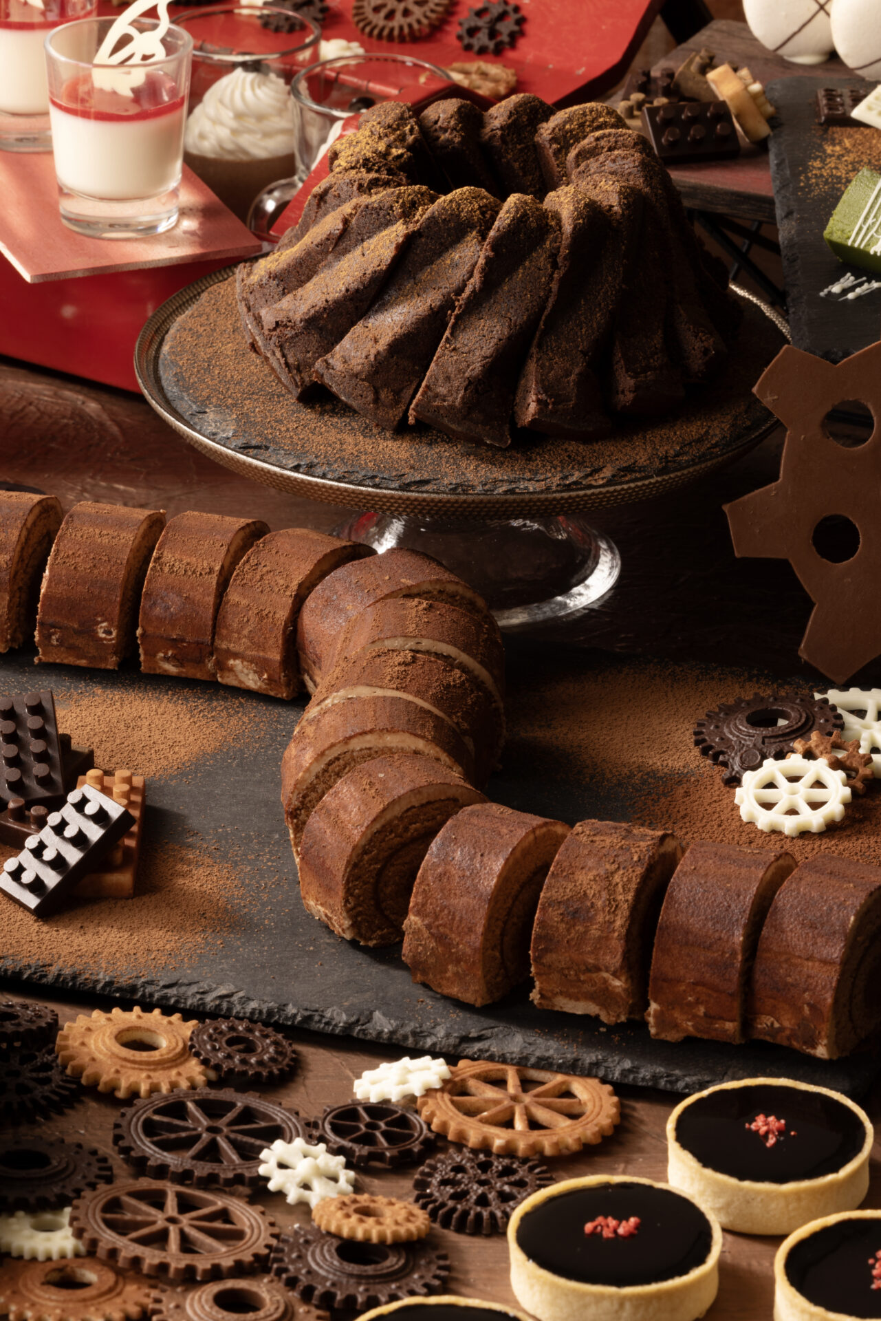 濃厚なガトーショコラや口どけなめらかなムースはもちろん、職人の工房から生み出されたような遊び心あふれる多彩なスイーツがずらりと並びます。