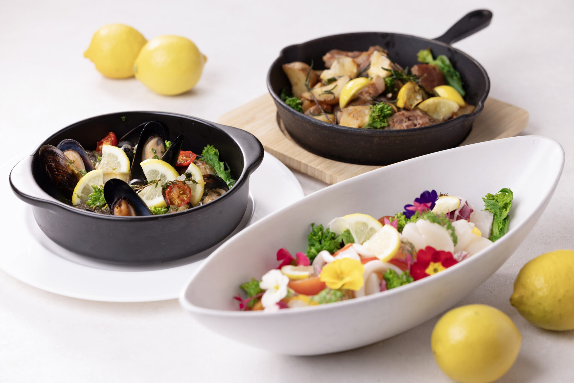広島県産レモンを皮まで丸ごと使用した無添加・無着色のレモンシロップと、伝統製法で仕上げたレモン果皮酢を用い、素材本来の爽やかな味わいを活かしたドリンクやスイーツ、ブッフェメニューをご提供いたします。