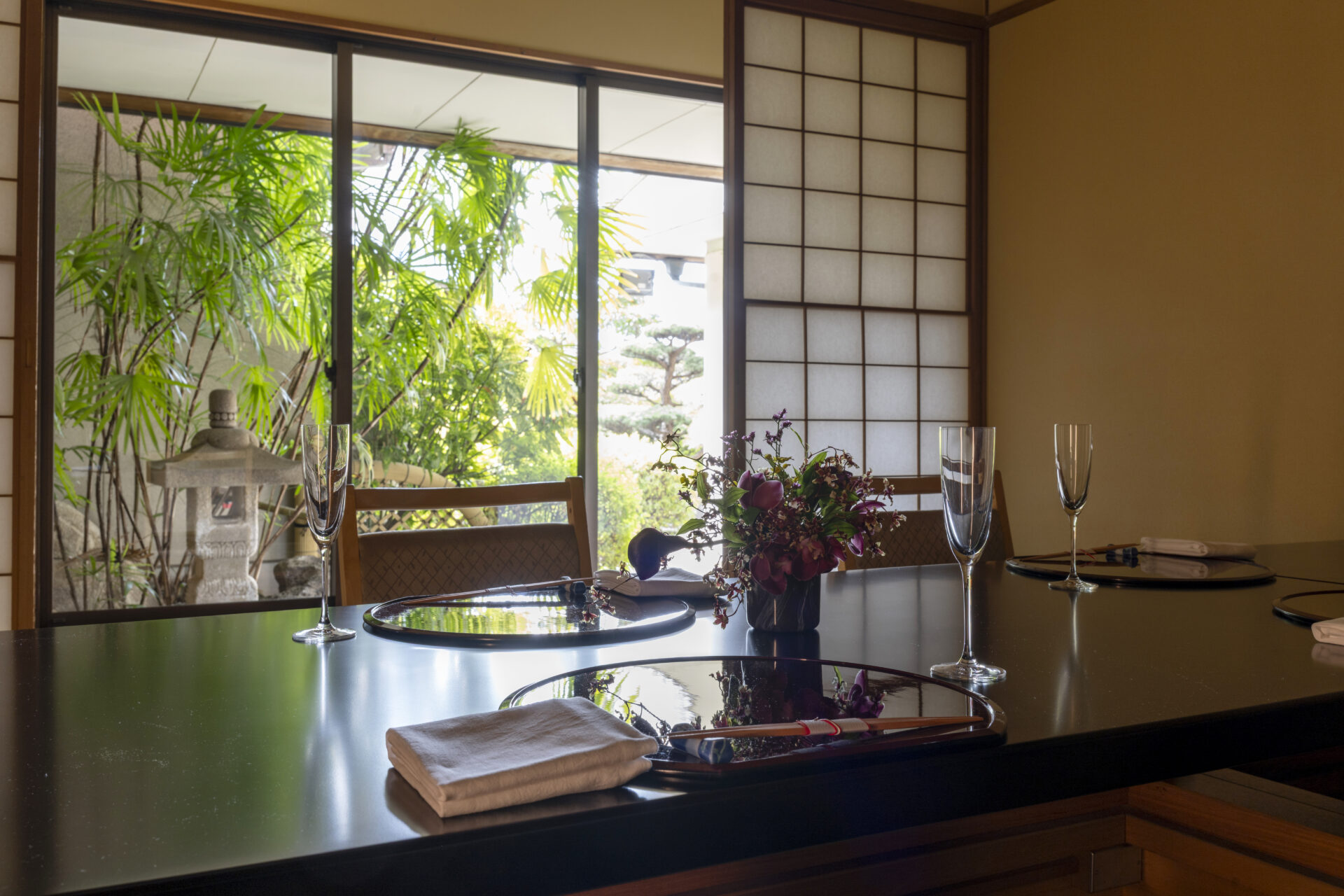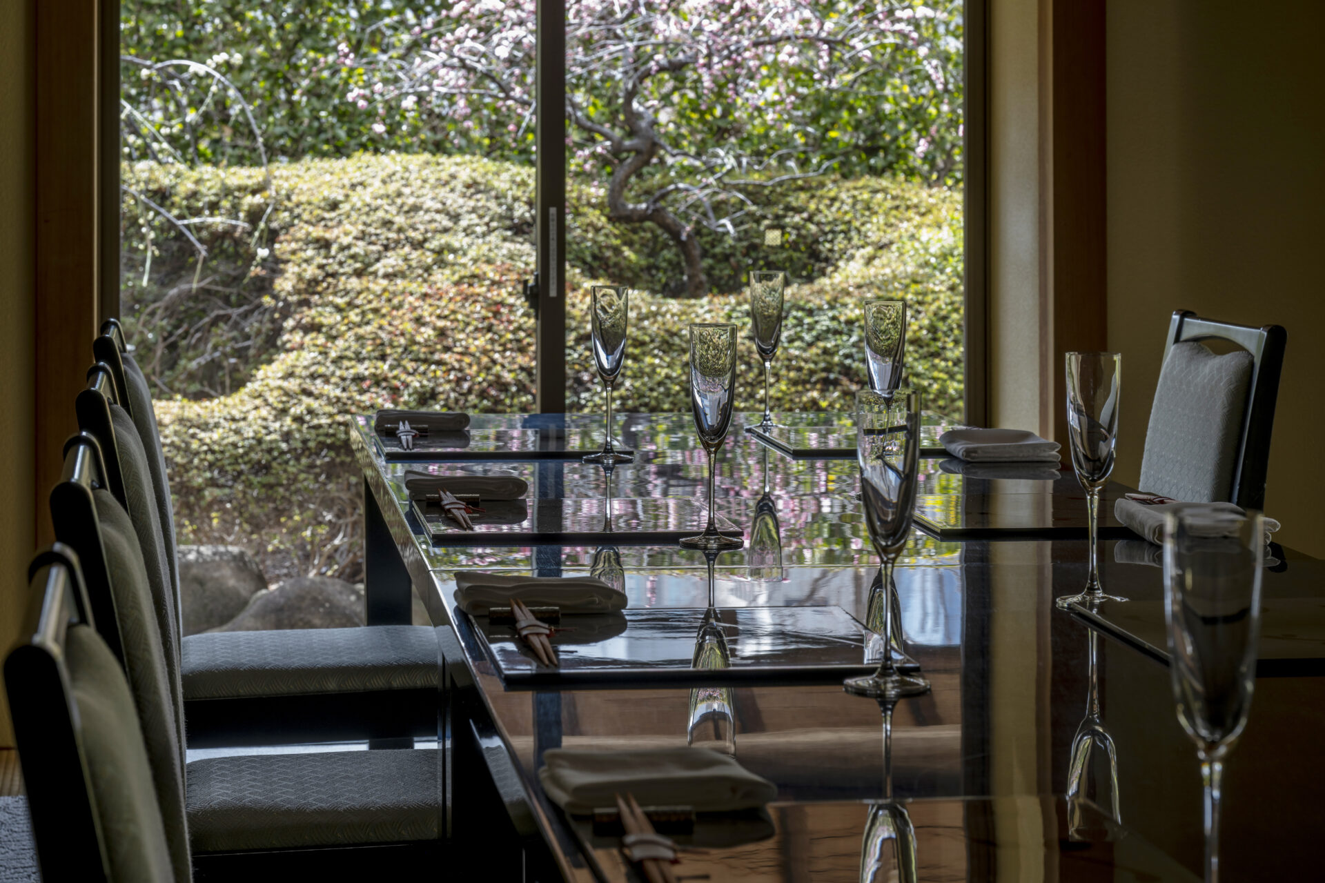6名様からご利用いただけるお座敷個室「鷹の羽(たかのは)」は、和の趣にモダンさを添えたテーブル席個室です。雪見障子の向こうに広がる日本庭園を眺めながら、ゆったりと落ち着いた時間をお過ごしいただけます。