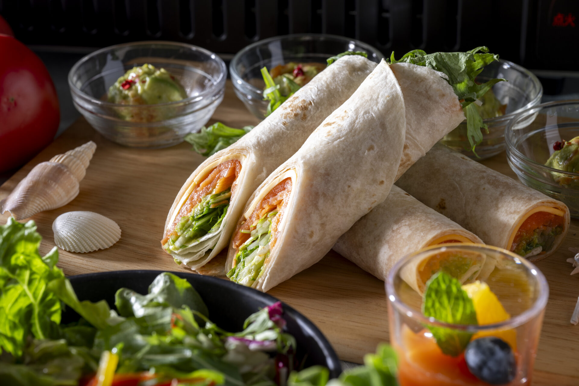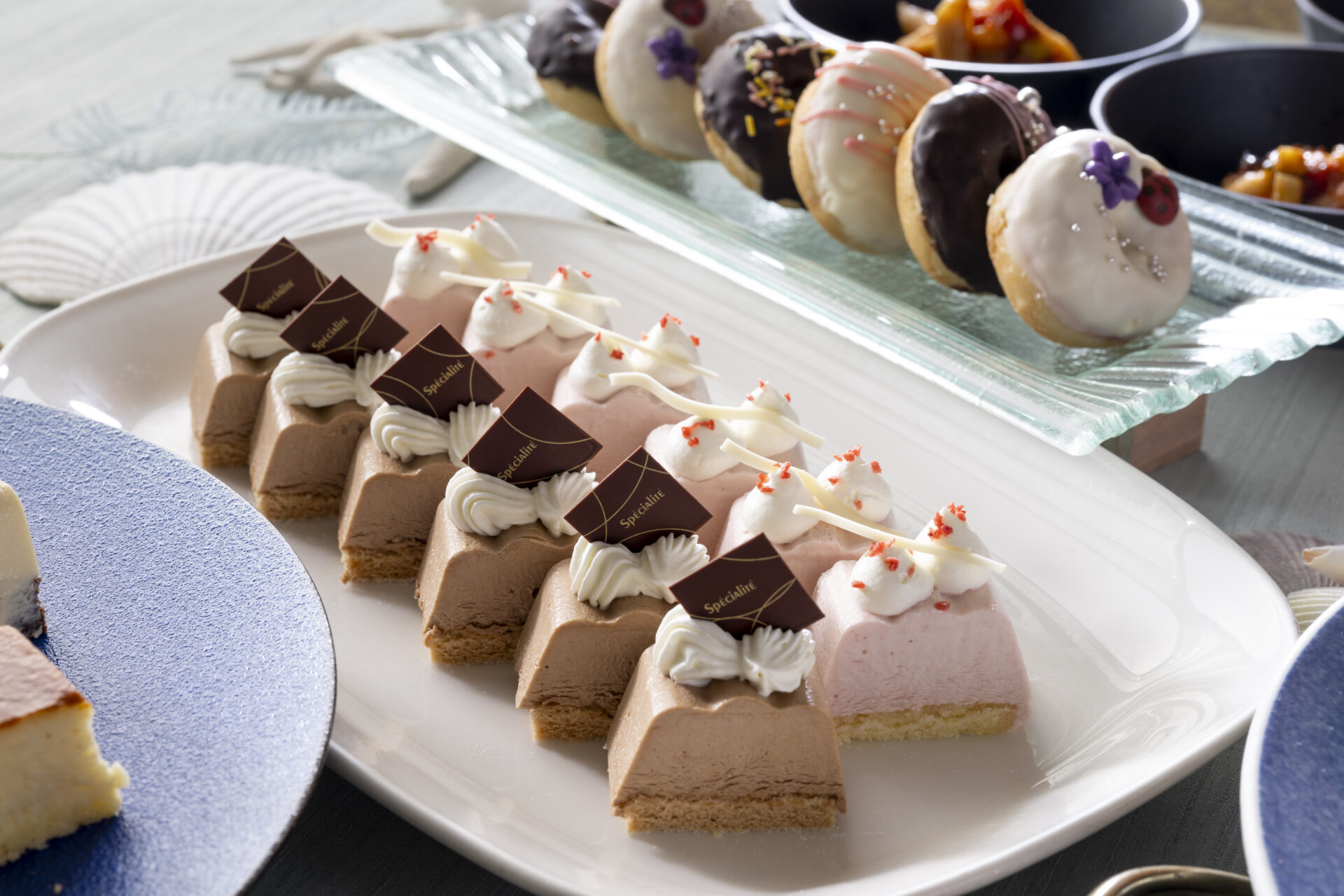 トルティーヤチップ/彩りサラダ/スパイシーチキンのチーズ焼き/ソーセージと野菜のブロシェット/バーベキュー(牛肉・豚肉・鴨胸肉)/穴子めしのおにぎり/デザートブッフェ/フリードリンク90分